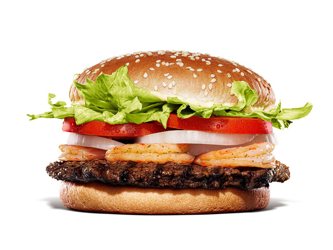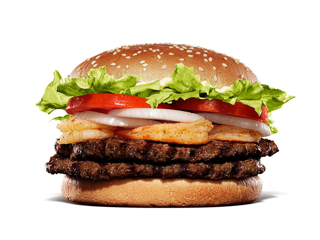 『ダブルシュリンプワッパー(R) 』は、バーガーキング(R) 自慢の直火焼きの100%ビーフパティ2枚に、ぷりぷりのエビにスパイスをきかせたガーリックシュリンプを重ね、フレッシュなレタス、トマト、オニオン、クリーミーなマヨネーズを合わせた、食べごたえ抜群のバーガーです。