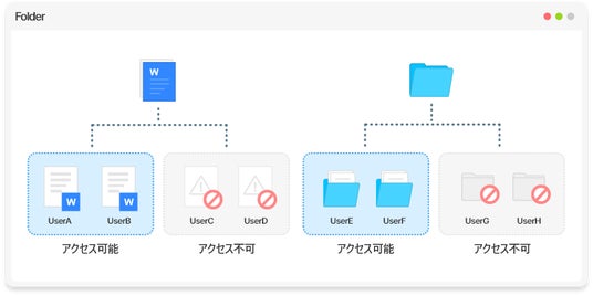 ・ ドキュメントごとにアクセス権限を細かく設定できます。特定のユーザーやグループに対して、閲覧、編集、ダウンロードなどの権限を付与できます。