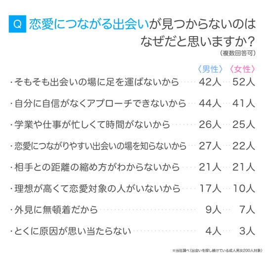 出会いを探し続けている成人男女200人に「恋愛につながる出会いが見つからない理由」を尋ねたところ、最多は「そもそも出会いの場に足を運ばないから」94人(47.00%)でした。