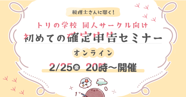株式会社エイシス(所在地:東京都千代田区、代表取締役:明石耕作)は、同人活動をサポートするサービス「トリオキニ」において、同人活動にともなう確定申告を学ぶ初心者向けオンラインセミナー『トリの学校 同人サークル向け はじめての確定申告セミナー』を開催いたします。