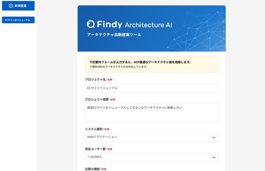 「Findy Architecture AI」の入力画面。フォームに要件を入力するだけで、アーキテクチャ図が自動生成される。