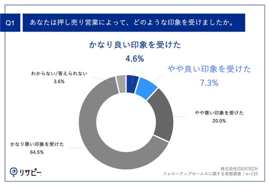 「Q1.あなたは押し売り営業によって、どのような印象を受けましたか。」(n=110)と質問したところ、「かなり良い印象を受けた」が4.6%、「やや良い印象を受けた」が7.3%という回答となりました。