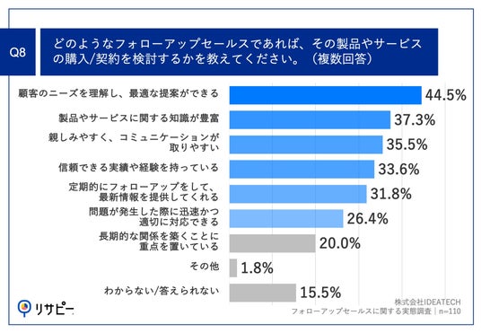 「Q8.どのようなフォローアップセールスであれば、その製品やサービスの購入/契約を検討するかを教えてください。(複数回答)」(n=110)と質問したところ、「顧客のニーズを理解し、最適な提案ができる」が44.5%、「製品やサービスに関する知識が豊富」が37.3%、「親しみやすく、コミュニケーションが取りやすい」が35.5%という回答となりました。