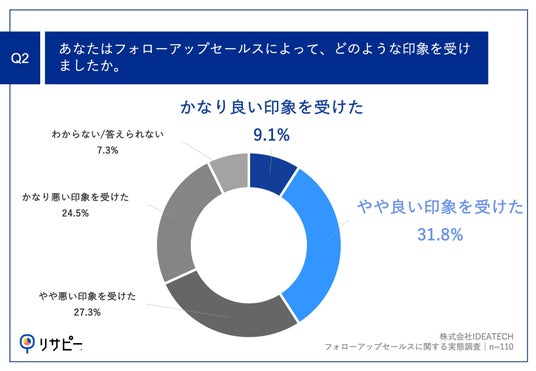 「Q2.あなたはフォローアップセールスによって、どのような印象を受けましたか。」(n=110)と質問したところ、「かなり良い印象を受けた」が9.1%、「やや良い印象を受けた」が31.8%という回答となりました。