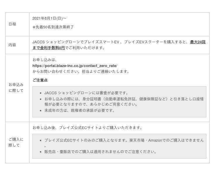 EVモビリティメーカーの株式会社ブレイズ(愛知県名古屋市、代表取締役:市川秀幸)は、令和3年8月1日(日)から、ブレイズスマートEVまたはブレイズEVスクーターをローンでご購入のお客様に対して、先着50名様限定で、利息分をブレイズが負担する「ゼロ金利キャンペーン」をスタートします。