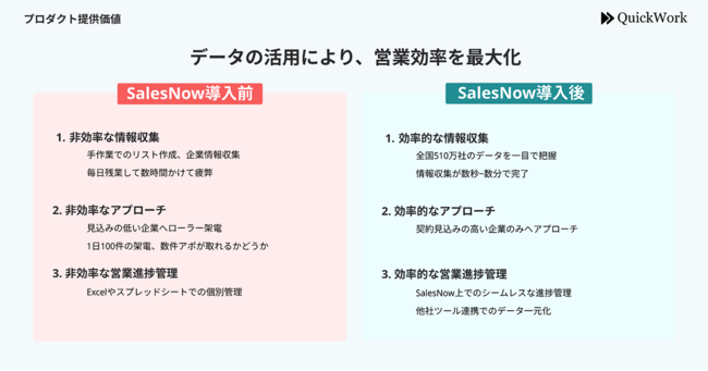 日本全国約510万社の企業データを基盤に営業の効率化を支援する「SalesNow」と組み合わせることで、受注角度の高い企業を抽出したり、セールス業務を自動化したりと営業効率を最大化することを目指していくことができます。
