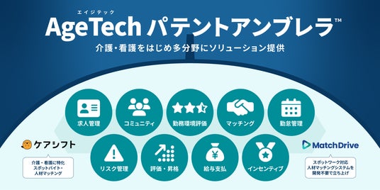 これら12の特許群をまとめた当社独自の枠組み「Agetech パテントアンブレラ(TM)」によって、今夏ローンチ予定の「ケアシフト」(介護・看護向けスキマバイトサービス)や、「マッチドライブ」(他社が自社ブランドで利用できるスキマバイト対応の人材マッチング基盤)のシステム全体が包括的に保護されます。