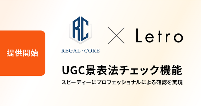 企業のマーケティングDXを支援するアライドアーキテクツ株式会社(東京都渋谷区、代表取締役社長 CEO:中村壮秀、証券コード:6081)でSaaS事業を展開するプロダクトカンパニー(カンパニープレジデント:村岡弥真人)が提供する運用型UGC(※1)ソリューション「Letro(レトロ)」は、薬機法・景品表示法・特定商品取引法に基づく、広告クリエイティブのリーガルチェック事業を手がける株式会社REGAL CORE(東京都渋谷区、代表取締役社長:田之上 隼人、以下REGAL CORE)と提携し、REGAL COREと契約する専門家によるよる監修のもとマーケティング利用したいUGC(※2)が景表法上の問題がないかをチェックする「UGC景表法チェック機能」を提供開始したことをお知らせします。