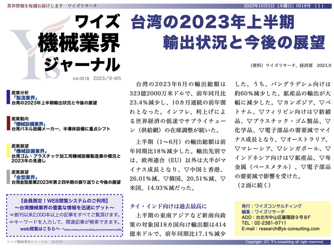 ワイズコンサルティング グループ(本社:中華民国台北市、代表取締役:吉本康志)は台湾機械業界専門誌「ワイズ機械業界ジャーナル」の2023年10月第1週号を発行しました。今週号では製造業界、機械設備業界、半導体業界、金型業界の動向を紹介します。