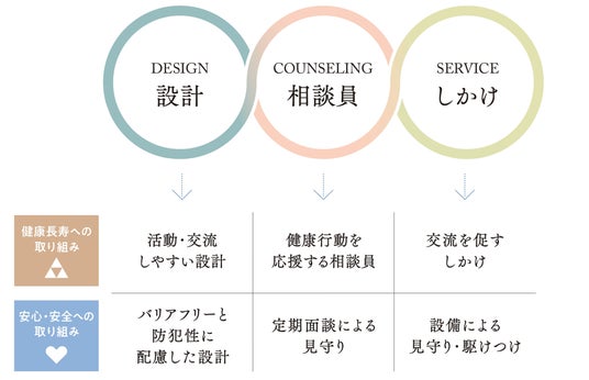 当社は2005年より、自立~フレイル期の高齢者向け賃貸住宅「ヘーベルVillage」を展開しています。住戸は1LDK~2LDK(45~75平方メートル )のバリアフリー仕様で、食事提供やスタッフ常駐はなく、夫婦での入居も可能な賃貸住宅です。社会福祉士等による月1回の相談訪問や緊急通報・見守りセンサーなど、安心のサービスを備えています。2022年には、日常生活の中で健康行動を支援し、フレイル予防を図る仕組み「安心・安全・健康長寿応援メソッド」を導入しました。このメソッドは、3つの要素で構成されています。