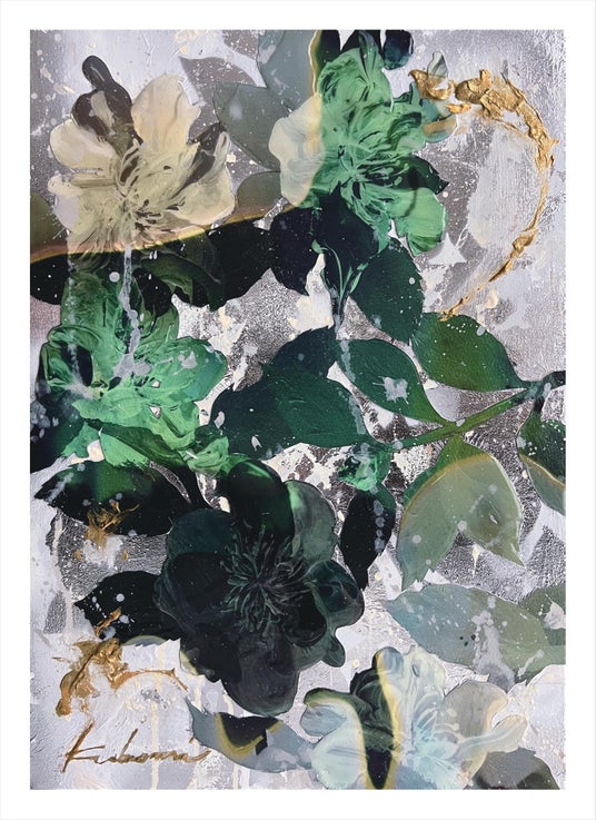 kubomiはアナログペイントとデジタル手法を組み合わせ、自然物のエネルギーを表現する画家です。特徴的なマーブル模様や色遣いは、意識/無意識の記憶がない混ぜになる生命のエネルギーを表し、うつろいゆくなかで浮かび上がる美しさを描いています。