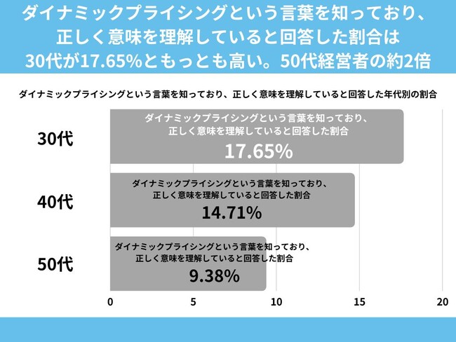 【ダイナミックプライシングという言葉を知っており、正しく意味を理解していると回答した割合は30代が17.65%ともっとも高い。50代経営者の約2倍】