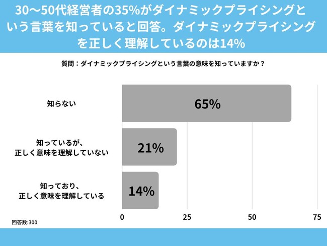 30代~50代の男女を対象とした「ダイナミックプライシングという言葉の意味を知っていますか?」というアンケートで最も多かった回答は「知らない」で65%でした。