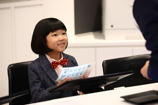 お客さん第一号として、「証券会社」パビリオンを体験する永尾柚乃さん(キッザニア東京にて) (C)KCJ GROUP
