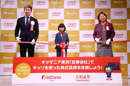 株式会社大和証券グループ本社(本社:東京都千代田区、代表執行役社長:荻野 明彦、以下 大和証券グループ本社)と、KCJ GROUP 株式会社(本社:東京都中央区、代表取締役社長:圓谷 道成、以下 KCJ GROUP)は、KCJ GROUPが企画・運営を行うこどもの職業・社会体験施設「キッザニア東京」(東京都江東区)において、2024年12月25日(水)に「証券会社」パビリオンをリニューアルオープンしました。オープンを記念したセレモニーでは、ドラマやバラエティで大活躍中の永尾 柚乃さんを迎え、テープカットやフォトセッションなど終始温かい雰囲気に包まれていました。