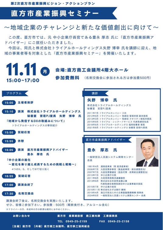 今回は、同氏と株式会社トライアルホールディングス矢野博幸氏を講師に迎え、地域の事業者等を対象とした「直方市産業振興セミナー」を開催いたします。