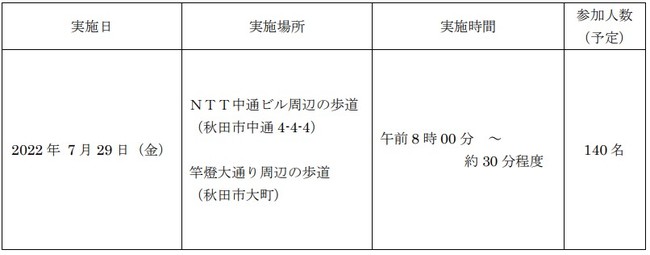 NTT東日本秋田支店(支店長 澤村 誉)を始めとするNTT秋田グループでは、社会貢献活動の一環として、秋田市中通のNTT中通ビル周辺及び秋田市大町の竿燈大通り周辺で「環境クリーン作戦」(清掃活動)を実施いたします。