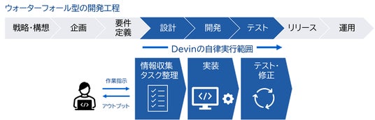例えば、企業のWebアプリケーションに新機能を追加する場合、自然言語で指示すると、Devinが関連資料や情報を読み解き、システム全体の構造と影響範囲を把握した上で、必要な作業工程を自動で策定します。続いて、プログラム作成ソフトやブラウザなどの開発ツールを操作し、プログラムの記述からテストまでを自律的に進めます。さらに、不具合を検知した場合は原因を特定し、修正が完了するまで改善作業を自動で反復します。