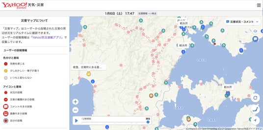なお、「災害マップ」には現在、被災地域にあたる石川県・富山県・新潟県が現在地となるユーザーであれば、誰でも周辺状況の投稿が可能です。投稿は「Yahoo!防災速報」アプリと「Yahoo!天気・災害」のウェブページ(スマートフォンブラウザー版)から受け付けています。
