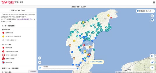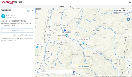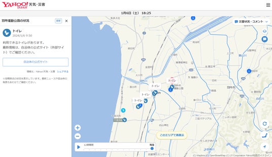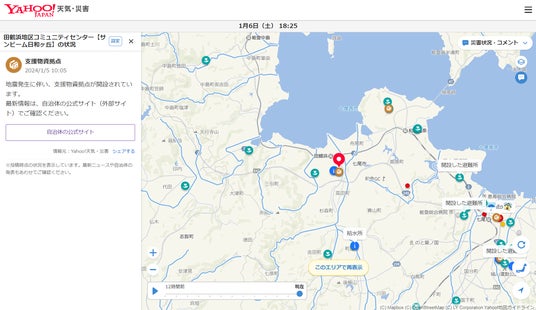 LINEヤフー株式会社(以下、LINEヤフー)が提供する、「Yahoo!天気・災害」と「Yahoo!防災速報」は、令和6年能登半島地震の被災地域となる石川・新潟・富山3県について、災害時にユーザー同士で状況を投稿し地図上で情報を共有できる機能「災害マップ」に、避難所、給水所、入浴・シャワー、トイレ、支援物資拠点、通行止めの情報を追加しました。「災害マップ」は「Yahoo!天気・災害」のウェブページ(PC版、スマートフォンブラウザー版)と「Yahoo!防災速報」アプリで確認できます。