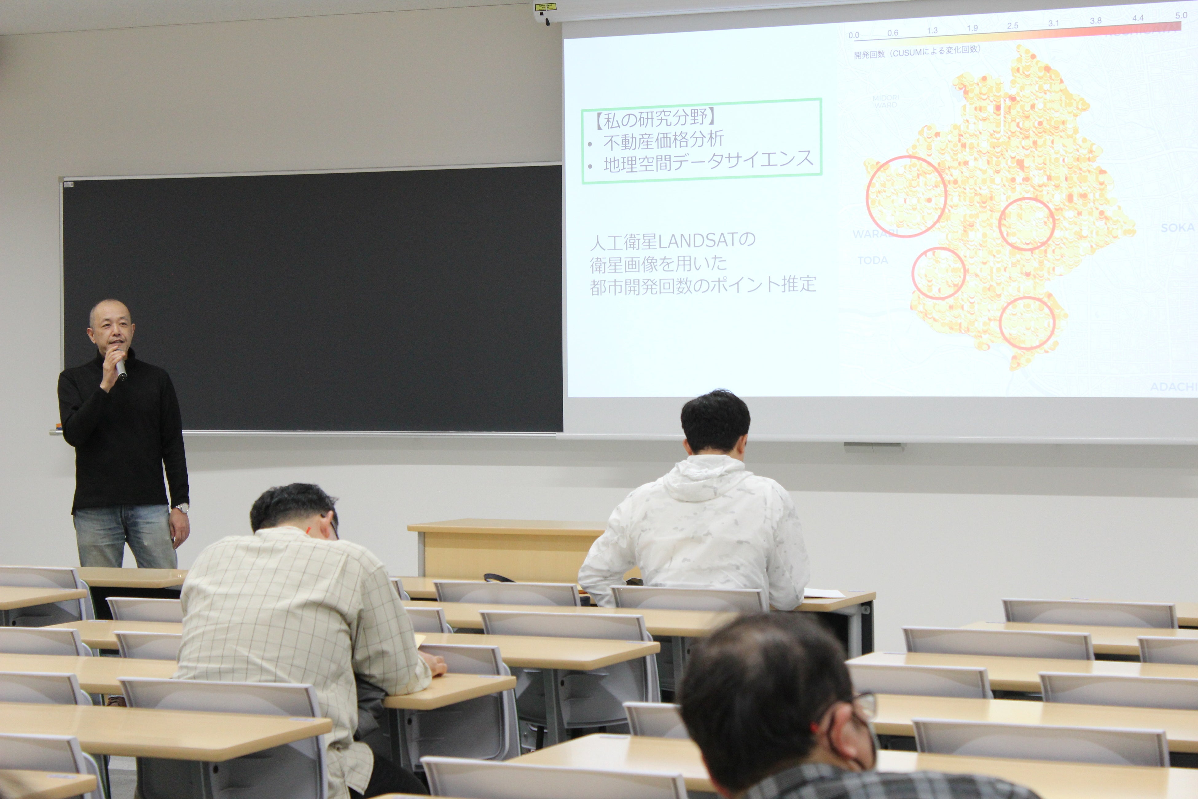 空気や水などの「見えない流れ」を可視化する最新の技術を解説しました。従来の手法では、レーザー光の反射(ハレーション)が邪魔をして見えにくいという課題を、紫外光(不可視光)と特殊な蛍光粒子を用いることで防ぎ、流体の混合過程などを鮮明に映像化する技術を紹介。また、産業界や美容分野で注目される「ナノバブル」について、あまりに微細なため「本当に存在しているのか分からない」という課題に対し、レーザーの散乱光パターンを解析することで、その場で手軽に計測できる簡易手法を開発したことや、これらの技術の社会実装に向けた取り組みについて報告しました。