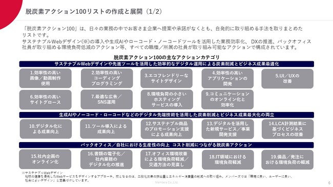 デジタルビジネス運用支援で企業の脱炭素DXを推進する株式会社メンバーズ(本社:東京都中央区、代表取締役社長:高野 明彦、以下「メンバーズ」)は、企業がデジタルをはじめとした日々の業務で実践できる取り組みリスト「脱炭素アクション100」を無料公開します。本リストは、サステナブルWebデザイン(※1)や生成AIといったデジタル先端技術の活用、DXの推進、バックオフィス部門が取り組める環境負荷低減のアクションなど、さまざまな企業で取り組める内容で構成されています。