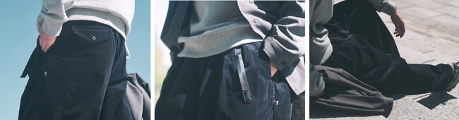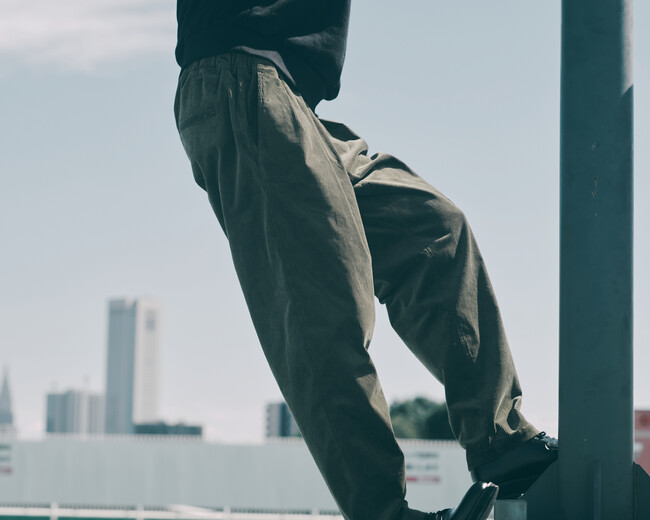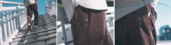 ブラウン・ネイビー・オリーブの3色展開となるこのパンツは、腰元のウェービングベルトに記された"ランニングマン"ロゴをそれぞれのパンツカラーにあわせて同色にアレンジしたほか、バックポケットを、フラップポケットとジップポケットの左右異なるデザインに。腰に膨らみのでる”is-ness”ならではの都会的なシルエットに、光沢感のあるコーデュロイ生地を使用し、洗練された雰囲気となったコレボレーションモデルです。