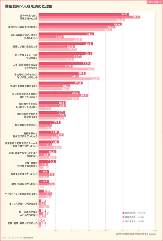 入社理由、「業界・事業への興味」が5割超でトップ勤続意向者は「理念への共感」、離職意向者は「成長できる環境」が上位にランクイン