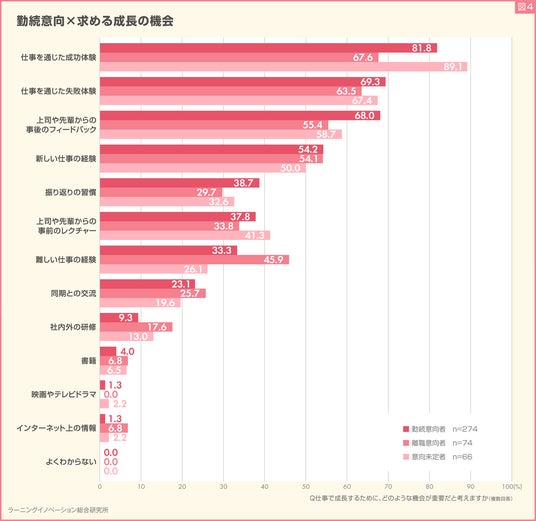 入社後成長するために求める機会勤続意向者は「フィードバック」、離職意向者は「難しい仕事」、意向未定者は「成功体験」