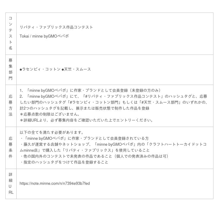 『リバティ・ファブリックス作品コンテスト Tokai / minne byGMOペパボ』では、藤久が運営する店舗やネットショップで購入した「リバティ・ファブリックス」の「ラセンビィ・コットン」の生地もしくは「天竺・スムース」の生地を使用した作品を「minne byGMOペパボ」上で募集します。作家・ブランドは、コンテストのハッシュタグと共に「ラセンビィ・コットン」、「天竺・スムース」の2部門どちらかのハッシュタグをつけ、「minne byGMOペパボ」に応募作品を登録します。