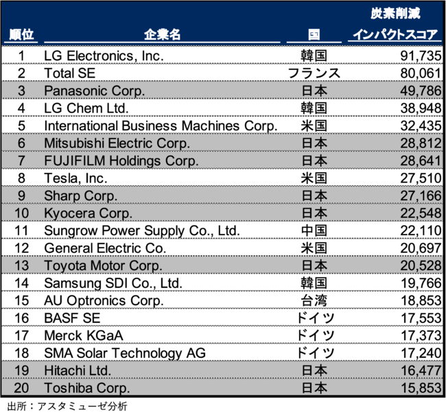 アスタミューゼが分析した、太陽光発電における炭素削減インパクトスコアランキングでは、韓国のLGエレクトロニクスが首位となりました。同社は、現在主流であるシリコン系太陽電池で高い競争力を保有しており、激化するパネルの高出力化競争の中でも、銀色の配線を太陽電池セル裏面に形成する裏面電極(バックコンタクト)技術を活用し、セル表面を遮光する配線を除去することにより、セルの全面を発電に活用することでの高出力化を実現しています。