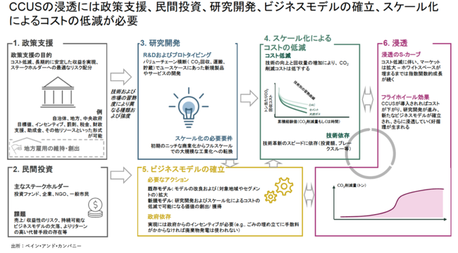 今後CCUSを収益化することにより浸透を拡大するためには、政策支援、民間投資、研究開発、ビジネスモデルの確立、スケール化によるコストの低減が必要となります。