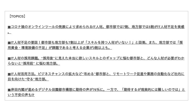 日本は世界と比べてデジタル後進国と言われています。しかし、都市部・地方部のそれぞれでIT人材活用の導入促進が少しでも向上すれば、日本全体のデジタル化は進み、 不安と考える方もまだ多い「デジタル田園都市構想」の発展にも繋がるのではと考えます。