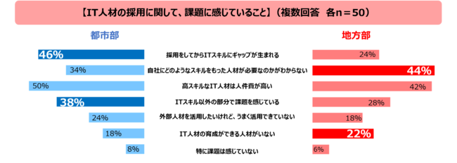 一方地方部では、都市部のように高スキルを求める業務も多いものの、それ以外に「自社にどのようなスキルを持った人材が必要かわからない」という方が約4割もいることが判明しました。また、「IT人材の育成」にも課題を感じると約2割が回答するなど、採用前に企業内で検討が必要な事項が多くあることがわかりました。