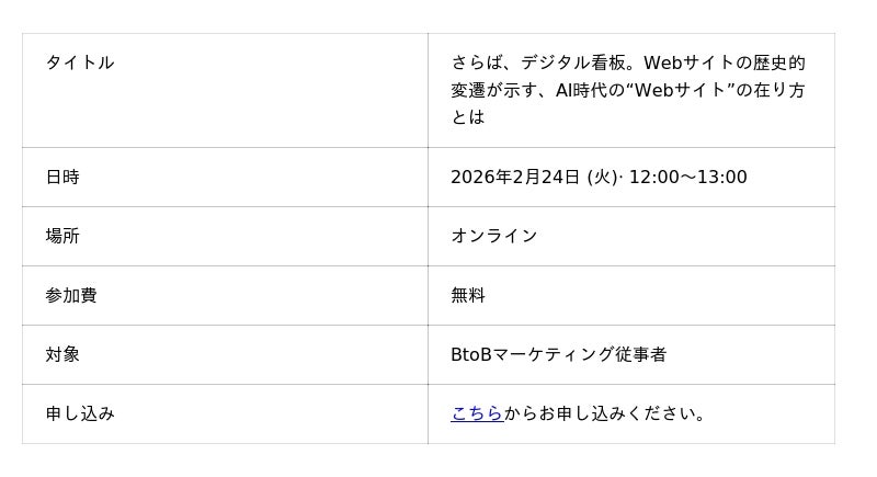 株式会社マツリカ(本社:東京都中央区、代表取締役CEO:黒佐英司、以下「当社」)は、2026年2月24日(火)に、高広伯彦氏が登壇するオンラインセミナー「さらば、デジタル看板。Webサイトの歴史的変遷が示す、AI時代の“Webサイト”の在り方とは」を開催することをお知らせいたします。