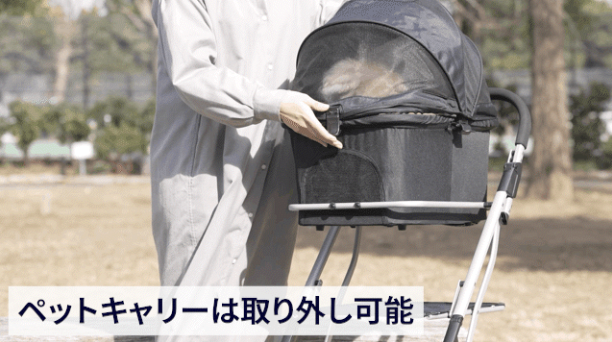 ペットキャリーは取り外しできるので、ペットカートとしても、手持ちペットキャリーとしても使用可。カートとキャリーはロック式です。