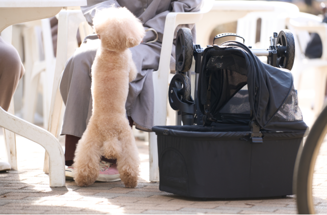 コンパクトに折りたためるから、お出かけ先やお店で置き場に困ることもなく、ペットといつでも一緒にいられます。