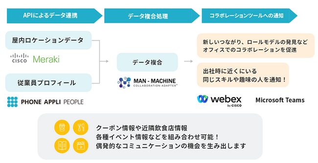 新型コロナウイルスの5類移行をきっかけに出社回帰に方針を切り替える中、自由裁量だとオフィスへ足が遠のくという従業員も多いのではないでしょうか。シスコシステムズ合同会社、ミツイワ株式会社、株式会社PHONE APPLIの3社は協業し、オフィスに従業員が出社したくなるような体験価値を向上させるソリューションを展示しています。具体的には、「Cisco Meraki」の居場所に関するデータと「PHONE APPLI PEOPLE」の従業員のプロフィールデータ、ミツイワが提供する「マンマシン・コラボレーションアダプター」を活用して連携し、ヒト・場所・データを掛け合わせることで、以下を可能にします。