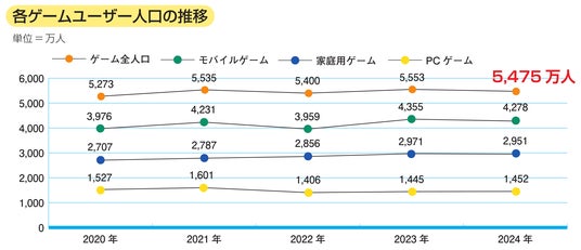 2024年のゲーム人口は5,475万人となり、前年の5,553万人から微減となりました。プラットフォーム別でみると、モバイルゲームが4,278万人で前年比1.8%減になったのに対し、PCゲームは1,452万人で0.5%増。家庭用ゲームはSwitchの発売から7年が経過して減速が懸念されたものの、2,951万人で0.7%減と大きな差異はみられませんでした。