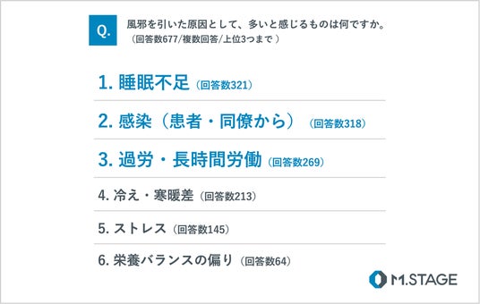 一方で、風邪を引いた原因としては、「睡眠不足」と回答した医師が最も多く、次いで「感染(患者・同僚から)」、「過労・長時間労働」という回答が続きました。健康習慣として「睡眠時間の確保」を意識していても、忙しさや不規則な勤務が実践を妨げていることがうかがえます。