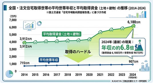 昨今、世界的な情勢不安を背景に、エネルギーや物流、資材価格の動向は依然として不透明な状況が続いています。加えて国内では、住宅価格の上昇、生活者の実質負担の増加、建設現場の担い手不足が重なり、住宅業界を取り巻く環境はこの5年で急激に厳しさを増しています。国土交通省の調査(※1)によると、土地付き注文住宅の取得資金は平均で6,188万円にのぼり、購入者の世帯年収は907万円にまで上昇しています。これは、平均世帯年収の1.7倍となり、注文住宅を取得できるのは高所得層に限られているのが現状です。このため工務店にはより高付加価値な提案力が求められており、価格を下げるのではなく、設計力や提案力、暮らし方への寄り添いなど、自社の価値を明確に伝えていくことが一層重要になっています。