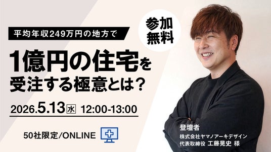 当社はこうした状況を踏まえ、商品供給にとどまらず、工務店の営業活動や住まい提案の付加価値向上を目的とした本セミナーを企画しました。当日は、青森県で1億円の住宅を販売する株式会社ヤマノアーキデザインの工藤晃史氏が登壇し、今後の住宅提案のあり方や、工務店が選ばれ続けるための考え方、生産性向上につながる視点をお伝えします。本セミナーを通じて、地域で質の高い住まいを提供し続けられる工務店の基盤づくりを後押しすることを目指します。