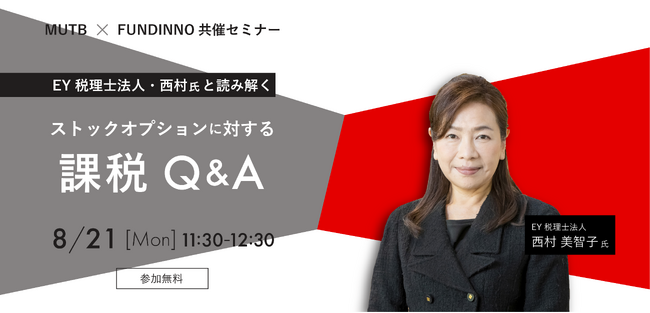 三菱UFJ信託銀行株式会社(東京都千代田区、取締役社長:長島 巌、以下「三菱UFJ信託銀行」)と株式会社FUNDINNO(本社:東京都品川区、代表:柴原 祐喜/大浦 学、以下「当社」)は2023年8月21日(月)に共催イベントを開催いたします。EY税理士法人・西村アソシエートパートナーと、国税庁が公開して話題となっている「ストックオプションに対する課税(Q&A)」を読み解くセミナーです。
