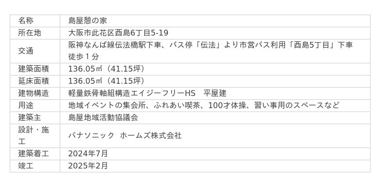 パナソニック ホームズ株式会社は、大阪府大阪市内の地域集会所を対象に、大阪市地域集会施設改修整備補助金(※1)を活用した施設の建て替え提案を推進しています。2024年度は、同補助金を活用した大阪市此花区『島屋憩いの家』をはじめ、新たに5棟の建て替えを実施。さらに、2025年度に2棟の竣工を予定しており、市内の公共施設建て替え累計数は、11棟(※2)にのぼる見込みです。