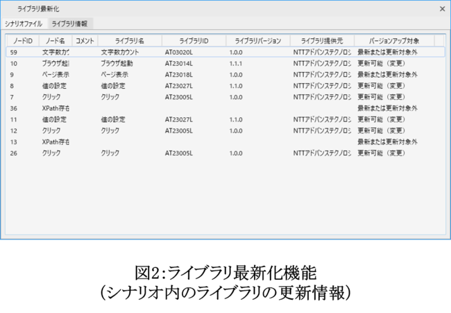 また、過去に作成したシナリオ内に含まれる部品を最新バージョンに自動で更新する「ライブラリ最新化機能」により保有シナリオを継続して使い続けることが容易になることに加え、問題発生時の実行環境情報など問題解決に必要な情報を収集する「ログ収集機能」などを具備することで、メンテナンス性が大幅に向上しました。