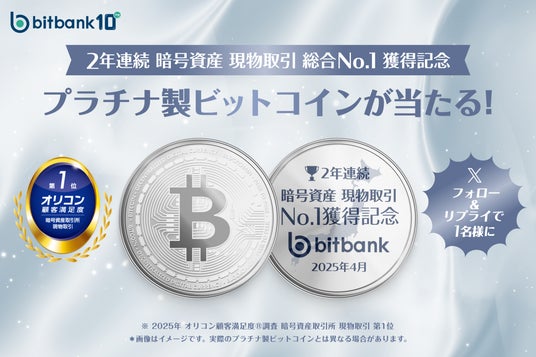 これを記念し、本日よりプラチナ製ビットコインが当たる「2年連続暗号資産総合No.1獲得記念」キャンペーンをXで開催いたします。