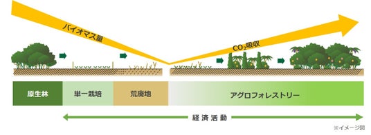 アグロフォレストリーのメリットのひとつに、「温室効果ガス」の一種であるCO2の吸収があります。下図は原生林を伐採した後に単一栽培を行い、アグロフォレストリー農法を行った際のバイオマス量※の変化をイメージしたものです。伐採によりバイオマス量が急減し、単一栽培によって土壌養分が枯渇し荒廃地化しますが、アグロフォレストリーに変換後は樹木の成長と共にCO2を吸収・固定していきます。農業という経済活動を行いながら森林を回復させる希少なモデルです。