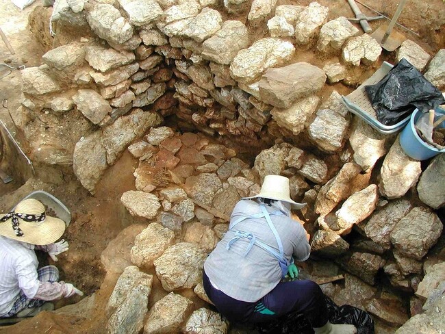 三ツ山古墳の横穴式石室は、1回だけの葬送で使用した後、入り口に石を積み、さらに土を盛って墳丘を築いています。これは、一般的に追葬を前提とする横穴式石室としては異例の構造です。担当の岩原学芸員は「古墳の制作技術が、1人だけを埋葬する竪穴式から複数人を埋葬する横穴式へ移り変わっていく途中で、初期の横穴式の特徴と考えられる」と分析します。