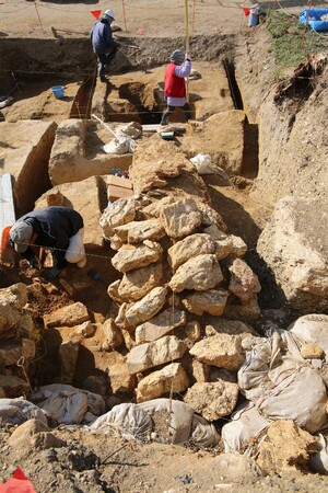入り口部分で、壁の役割を果たす左右の石積みは比較的良好な状態で残されています。また裏込めに使用された石は、後に作られた古墳と比較すると非常に大きいものが使用されており、これも初期の横穴式石室の特徴と考えられます。