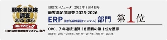 ビジネスコンサルタント(代表取締役社長:和田 成史/本社:東京都新宿区/以下OBC)は、日経BP社が実施する「日経コンピュータ 顧客満足度調査2025-2026」において、ERP(統合基幹業務システム)部門で7年連続・通算18回目(※)の第1位、さらに人事・HRテックソフト/サービス部門でも第1位を獲得いたしました。(※)受賞年:2005年~2011年、2014年~2017年、2019年~2025年)